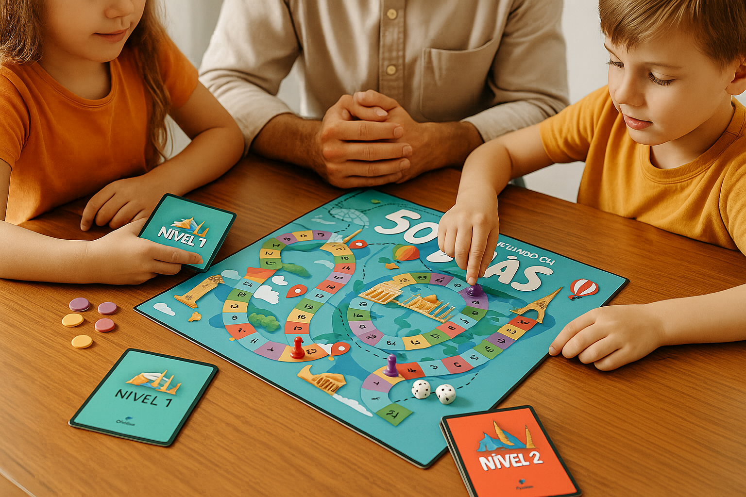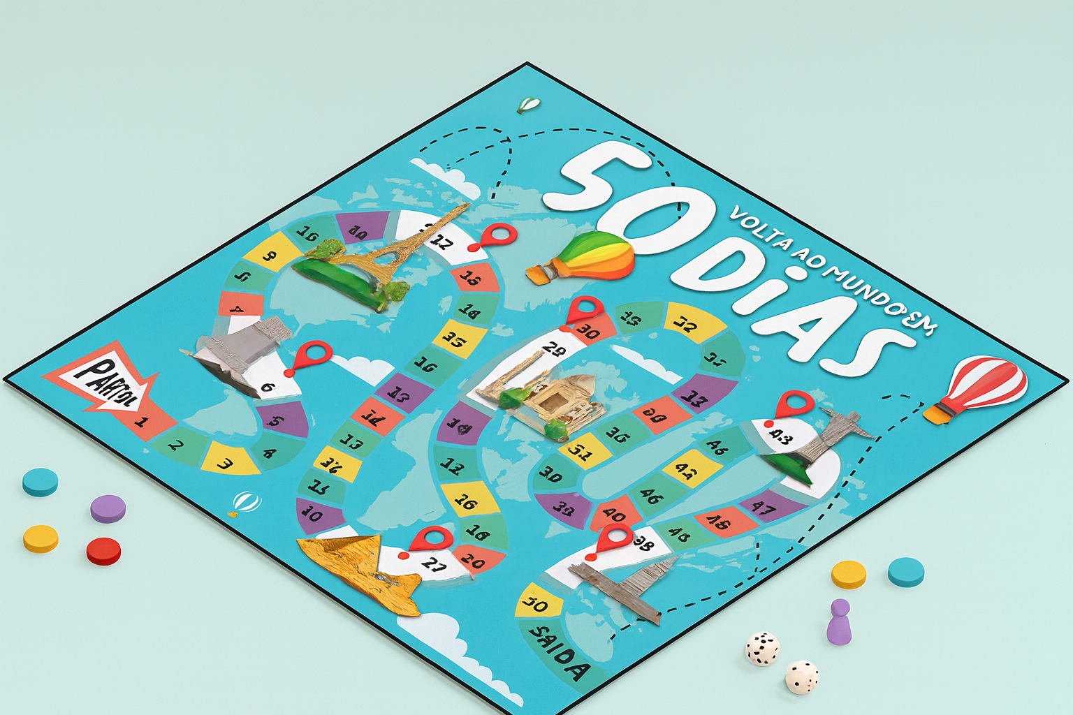 - 1 Tabuleiro com casas coloridas (correspondentes às cores das perguntas) e cinco casas brancas (perguntas de cultura geral);