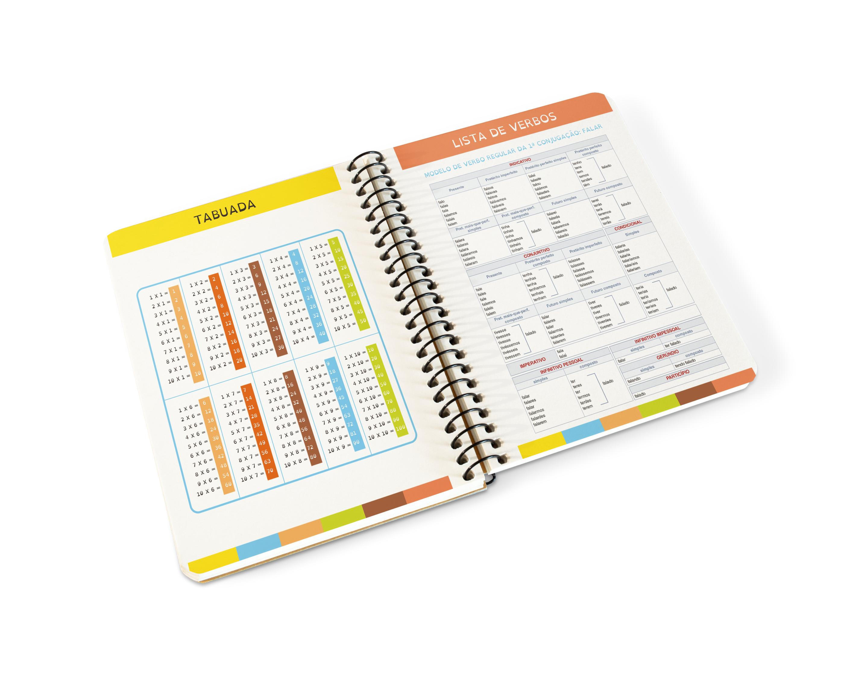 - Páginas com ferramentas úteis: tabuada, lista de verbos (1ª, 2ª e 3ª conjugações e irregulares).