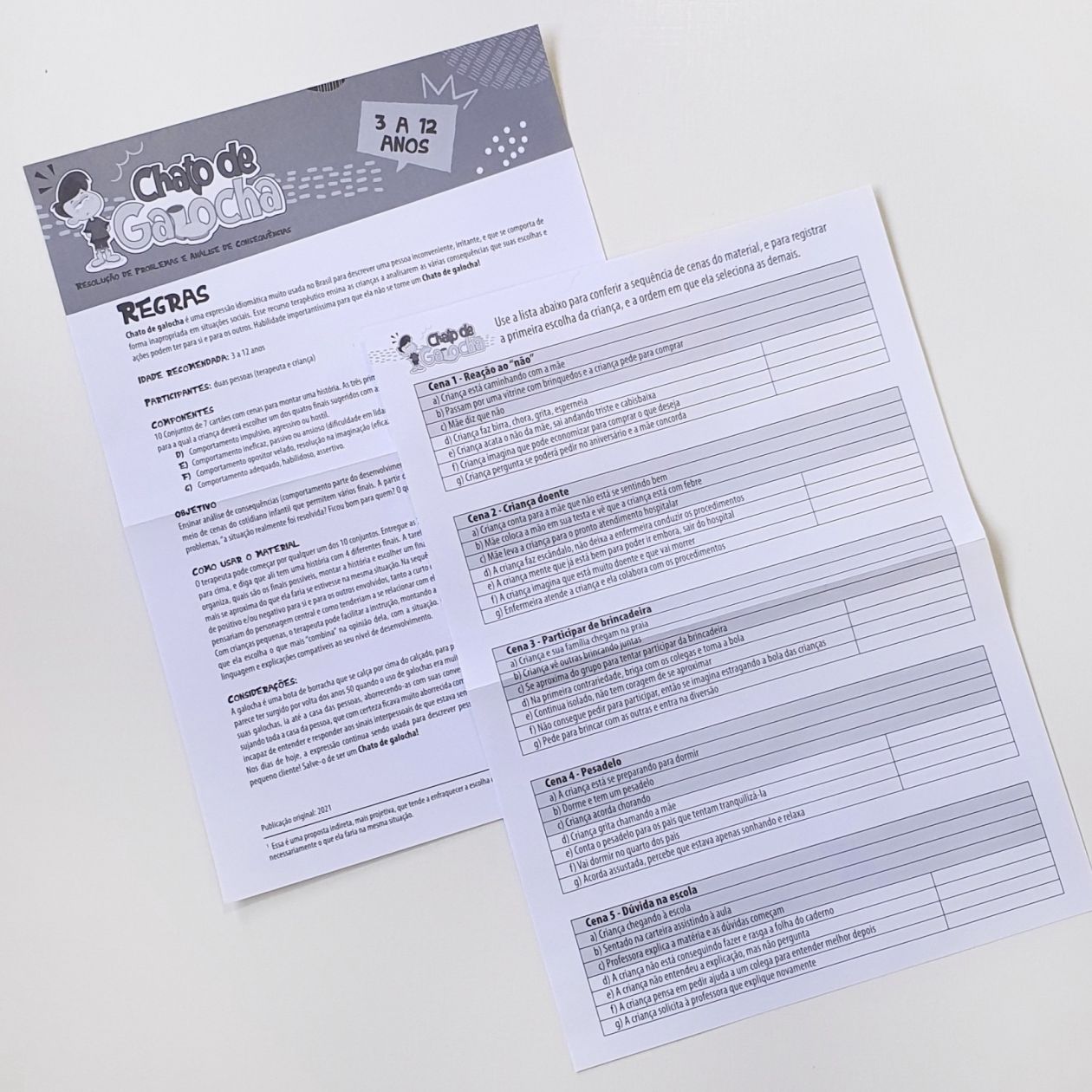 Chato de galocha é um recurso terapêutico que ensina as crianças a analisarem as várias consequências das suas escolhas. A partir de histórias com quatro finais diferentes, a criança pode pensar nas consequências que as suas ações podem ter para si e para os outros.